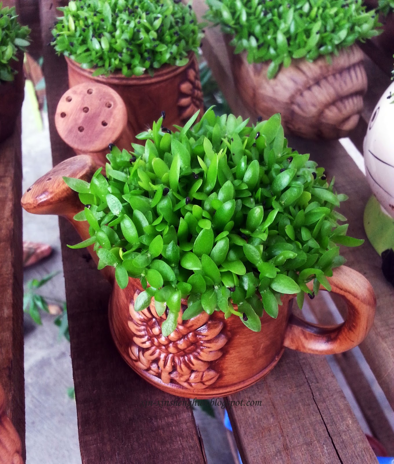 下面的这张图就是其中一个很可爱的盆栽~ 我觉得不应该叫他做盆栽, 应该叫做植物球~ 因为那个植物就是生长在一个圆圆的泥土上~~~